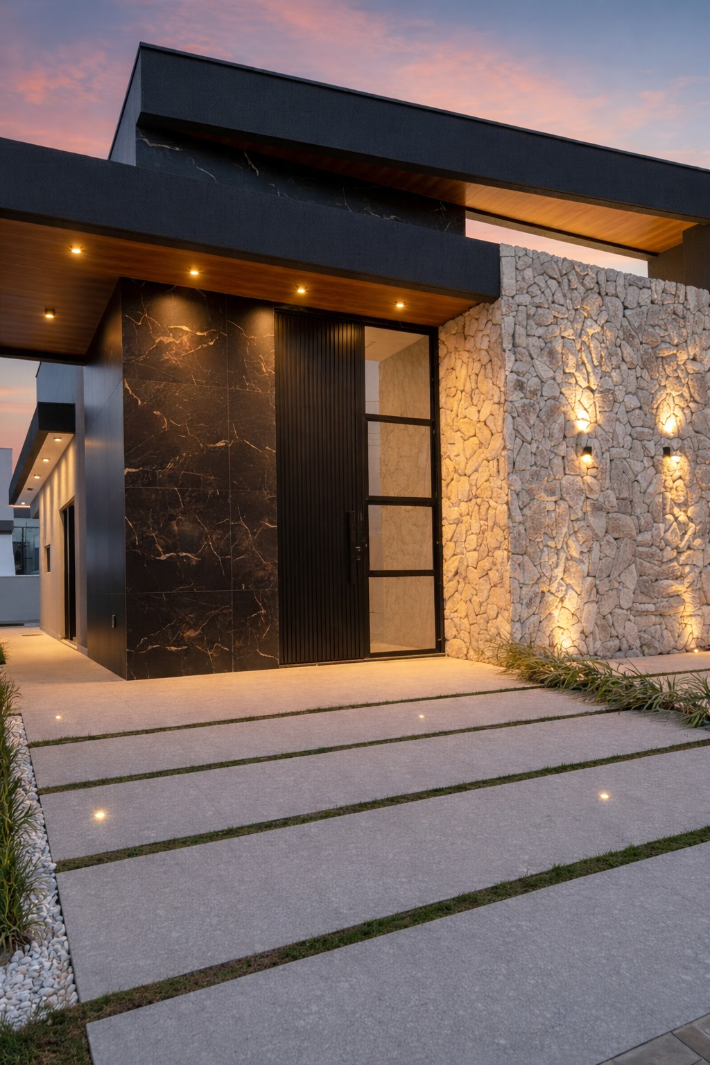 E para completar, a fachada ganha um toque especial com iluminação em fita de LED e um belo jardim com plantas, criando uma atmosfera acolhedora logo na chegada.