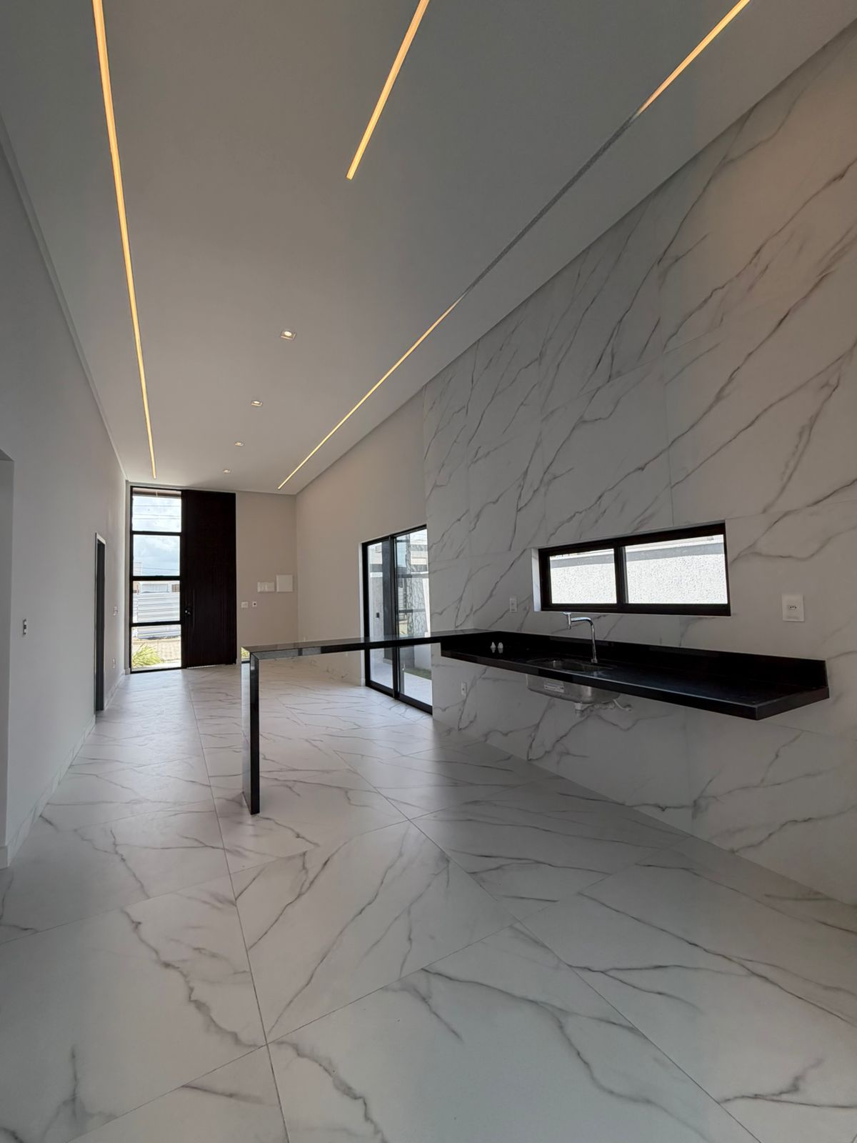 O projeto também valoriza o design contemporâneo, com forro de gesso detalhado, esquadrias em alumínio preto linha suprema, portas internas modernas com vedação e amortecimento, além de uma imponente porta de entrada em alumínio com fechadura eletrônica, garantindo mais segurança e praticidade.